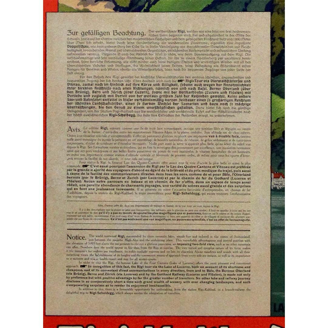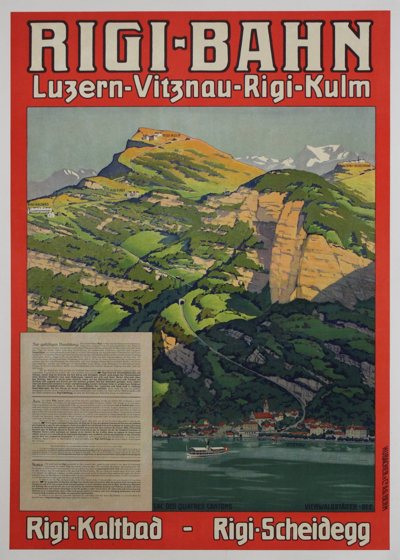 This stunning circa 1910 original travel poster promotes the Rigi-Bahn railway route from Luzern through Vitznau to Rigi-Kulm, one of the most picturesque and historic rail journeys in Switzerland. With bold Art Nouveau-influenced typography and a composition bursting with color and clarity, the poster beautifully captures the appeal of alpine travel in the golden age of tourism.