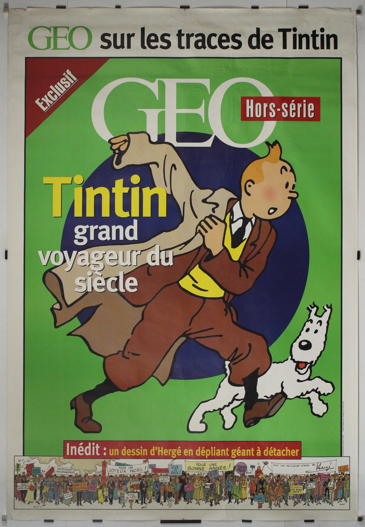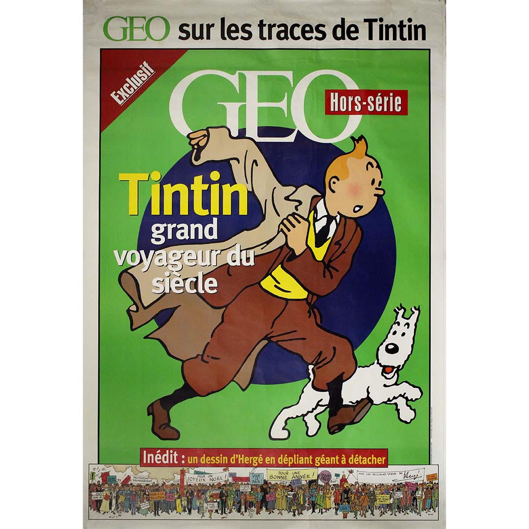A delightful tribute to one of the most iconic adventurers in literary history, this 2000 original poster celebrates the GEO magazine Hors-série issue titled “Sur les traces de Tintin” (“In the Footsteps of Tintin”). With vibrant colors and unmistakable ligne claire illustration, the poster features a dynamic image of Tintin dashing forward—coat flaring, faithful Snowy (Milou) at his side—symbolizing the unrelenting curiosity and action-packed travels that define his legacy.