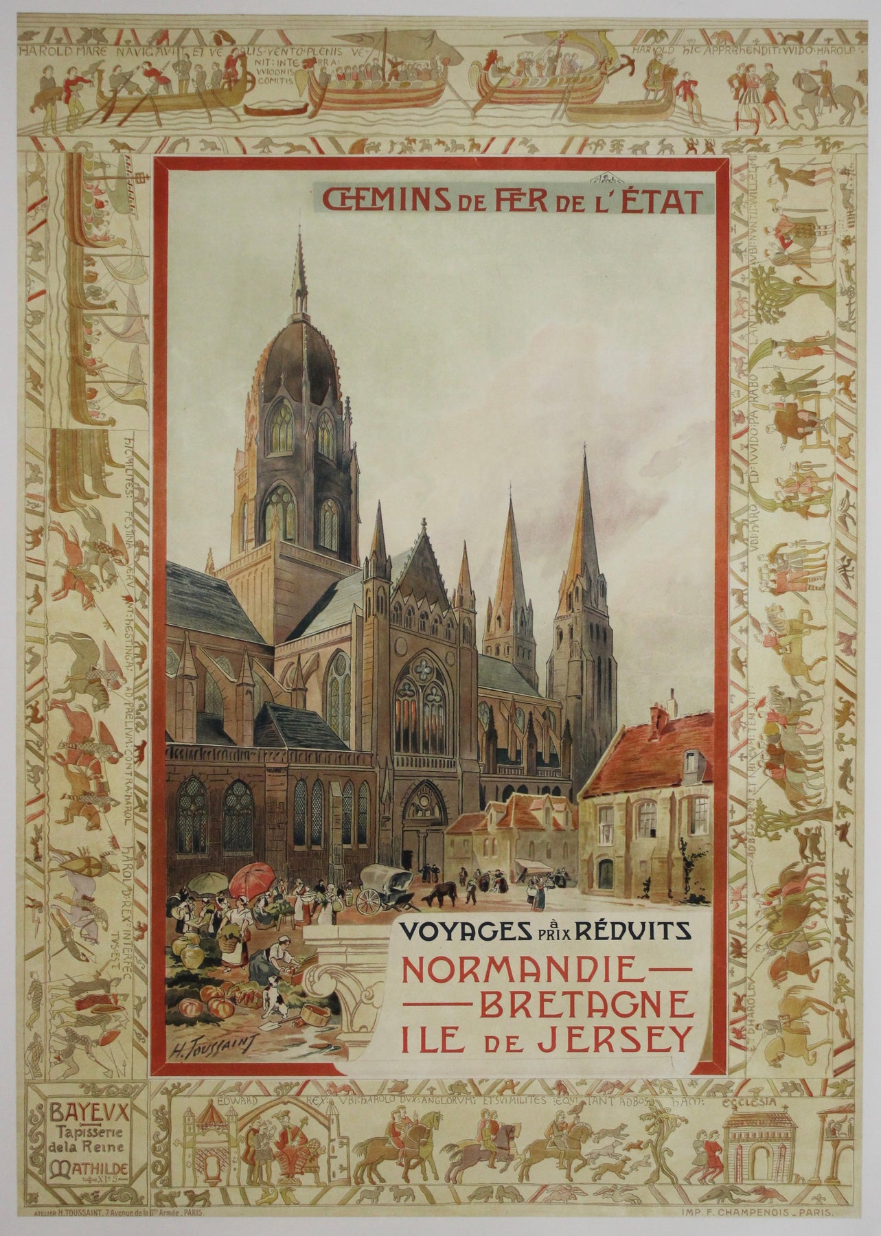 This magnificent turn-of-the-century lithographic poster by Henri Toussaint is a celebration of France’s historic western regions—Normandy, Brittany, and the Île de Jersey—promoted by the Chemins de fer de l'État, the State Railway system, as part of a campaign to encourage regional travel through reduced-fare excursions.
