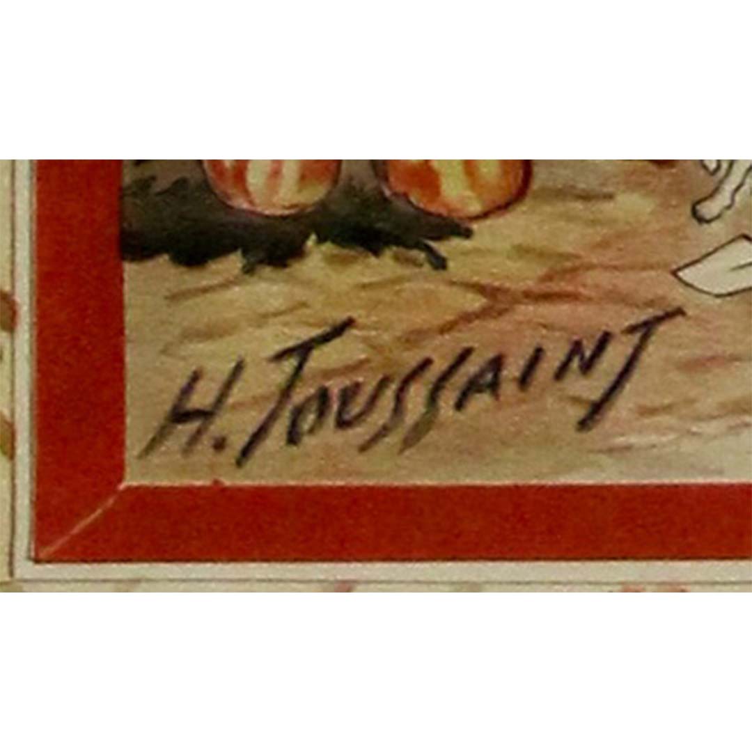 At the center of the composition rises the Bayeux Cathedral, rendered in exquisite architectural detail with its towering Gothic spires and ornate stonework. The cathedral, a jewel of Norman heritage, is animated by a bustling market scene at its base—figures in period costume, umbrellas, carts, and florists fill the square with a sense of local color and vivacity. Toussaint, a noted painter and illustrator of historical subjects, evokes both the majesty and the daily life of the region in a delicate, painterly style.