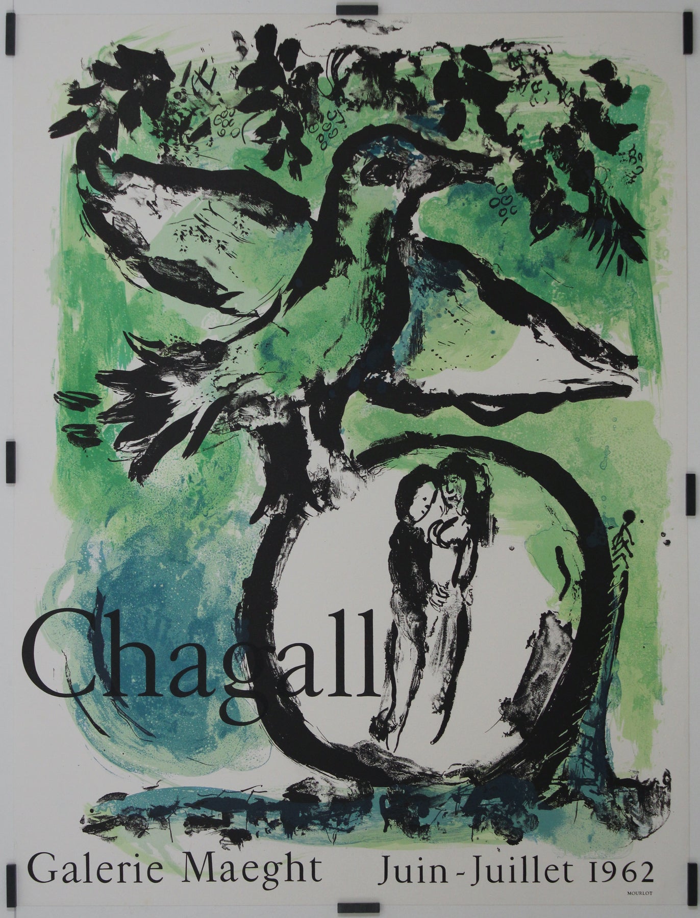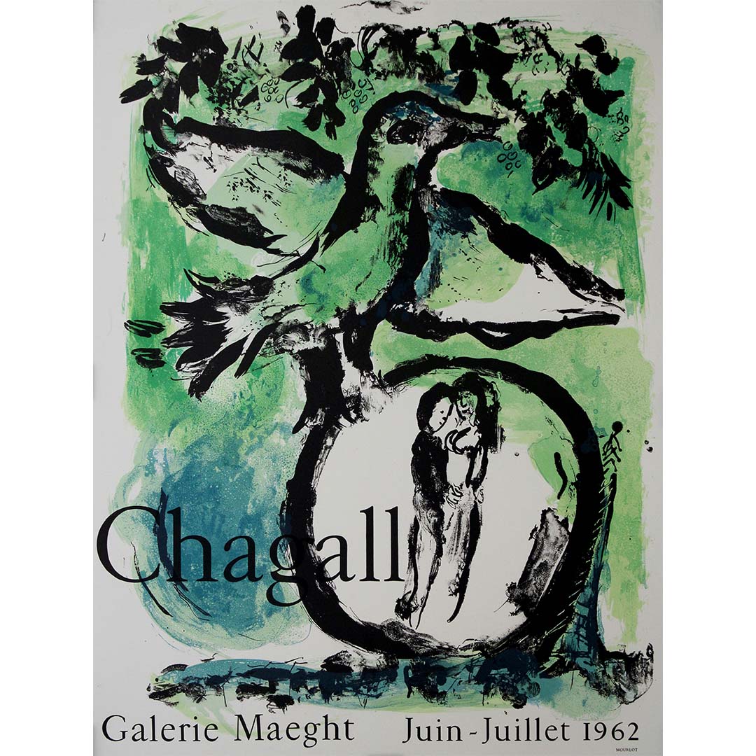 Dreamlike and poetic, this original 1962 lithographic poster was created by Marc Chagall for his exhibition at the renowned Galerie Maeght in Paris, held during Juin–Juillet 1962. Titled L’Oiseau Vert, the work features one of Chagall’s most enduring symbols—a fantastical bird, perched like a guardian spirit over two tender, embracing figures enclosed within the sweeping curves of a tree.