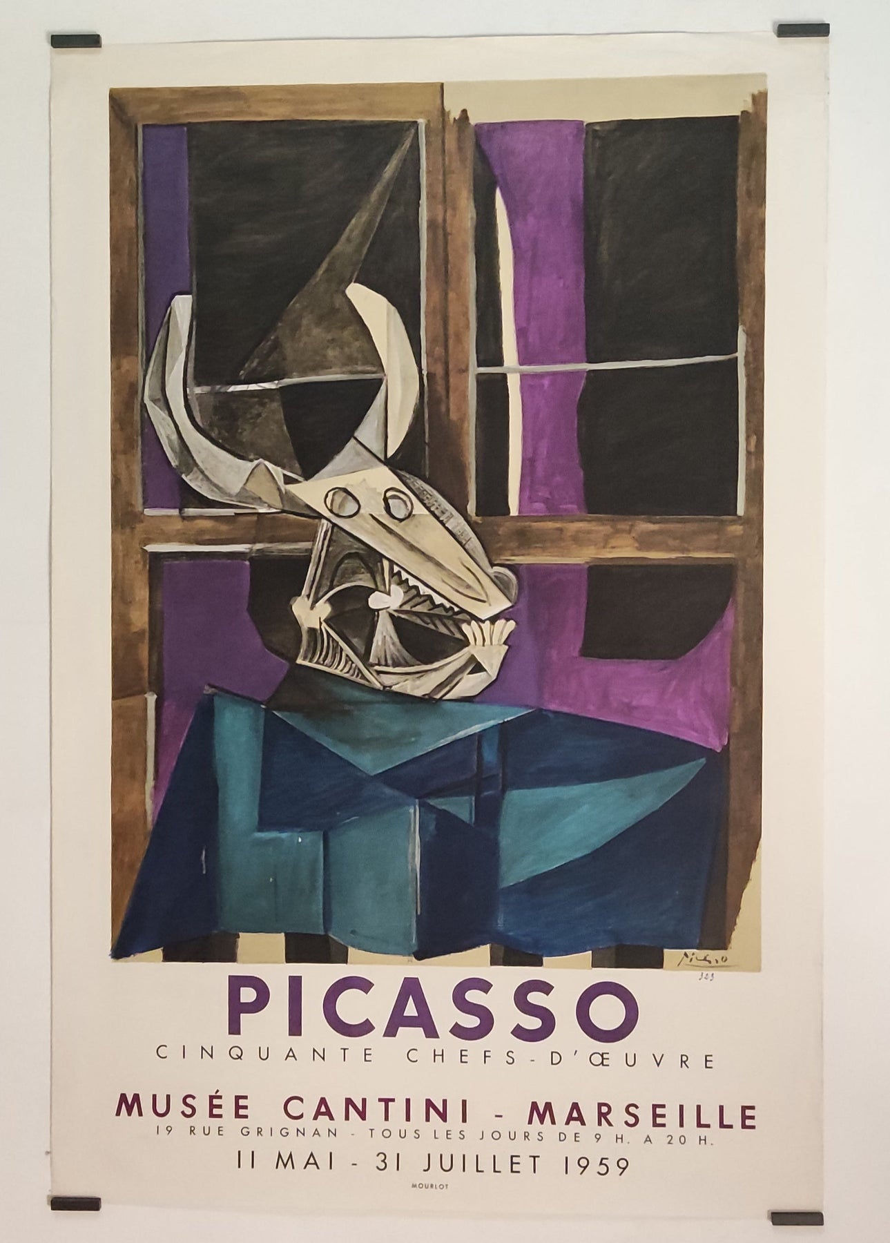 Bold, theatrical, and unmistakably Cubist, this original 1959 poster was created by Pablo Picasso for the exhibition Cinquante Chefs-d’Oeuvre (“Fifty Masterpieces”) held at the Musée Cantini in Marseille. The show brought together some of Picasso’s most significant works, and this striking composition served as the official image for the event.