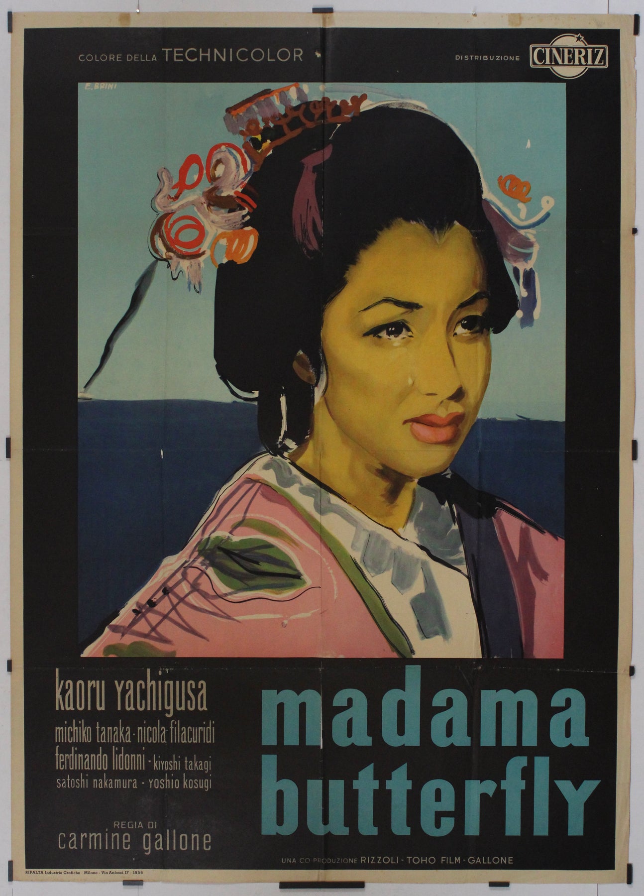 This elegant 1956 Italian film poster by E. Brini captures the poignant beauty and emotional depth of Madama Butterfly, a cinematic adaptation of Giacomo Puccini’s beloved opera. Painted in bold strokes yet soft tones, the image of a serene yet sorrowful Japanese woman dominates the composition, evoking the tragic heart of the story—Cio-Cio-San, the young geisha at the center of this East-meets-West drama.