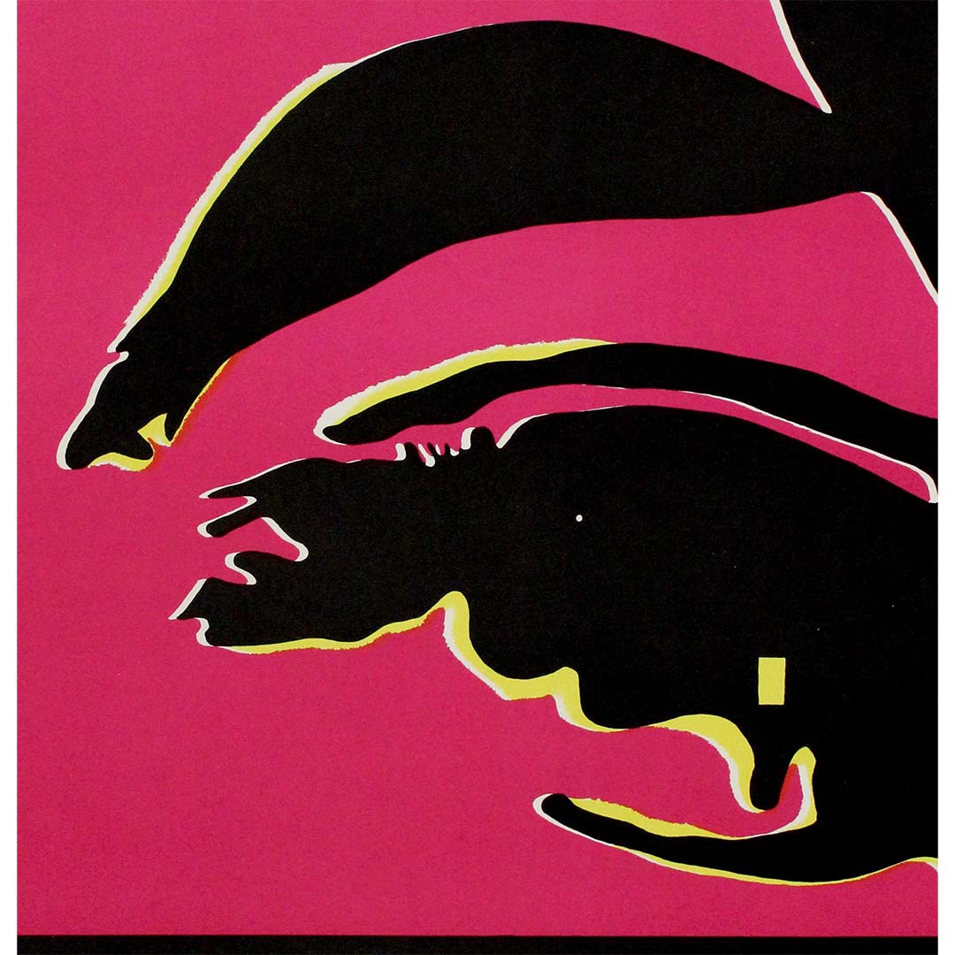 A pioneer of the French Nouveau Réalisme movement, Raysse blended glamour and critique in his exploration of consumer culture, plastic beauty, and artificial color. This poster is no exception: with its blazing fuchsia backdrop, cutout-style female profile, and shadowy black forms outlined in acid-yellow, it creates a near-hallucinogenic contrast that pulses with visual energy. The hand-rendered neon typography glows against the black bands above and below, recalling the commercial signage of American pop culture while exuding an unmistakably European sophistication.