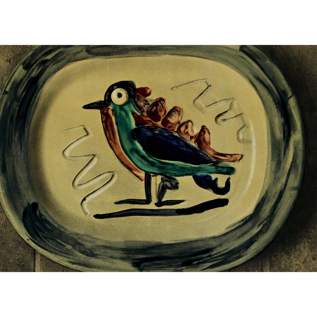 The composition is striking in its simplicity: a ceramic dish featuring a whimsical bird rendered in Picasso’s instantly recognizable hand, set against a rustic tile background. The stylized animal form, vivid color palette, and free-flowing lines exemplify Picasso's joyful exploration of ceramics — a medium he embraced with boundless enthusiasm from the late 1940s onward. The bird, often a symbol of freedom and vitality, reflects the artist’s lifelong fascination with nature and form distilled to its purest visual language.