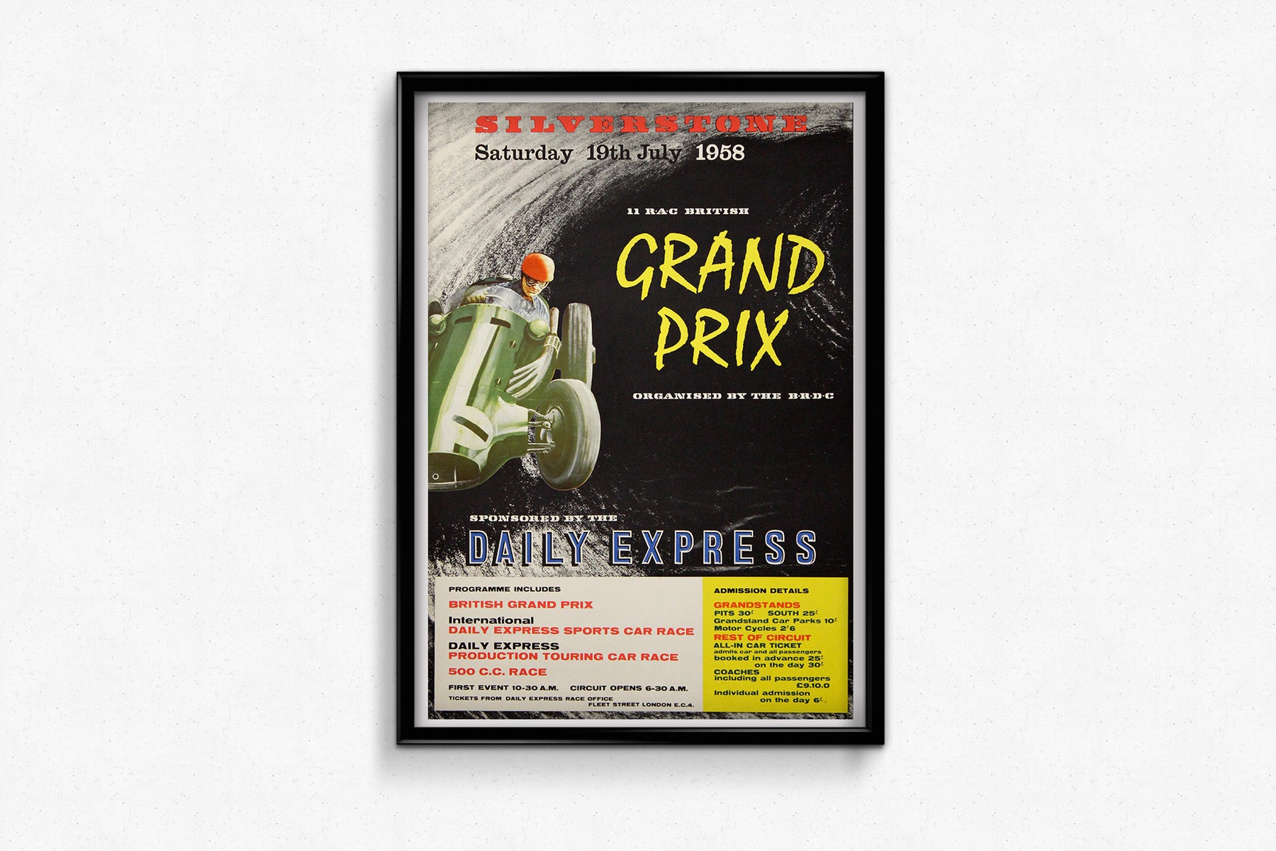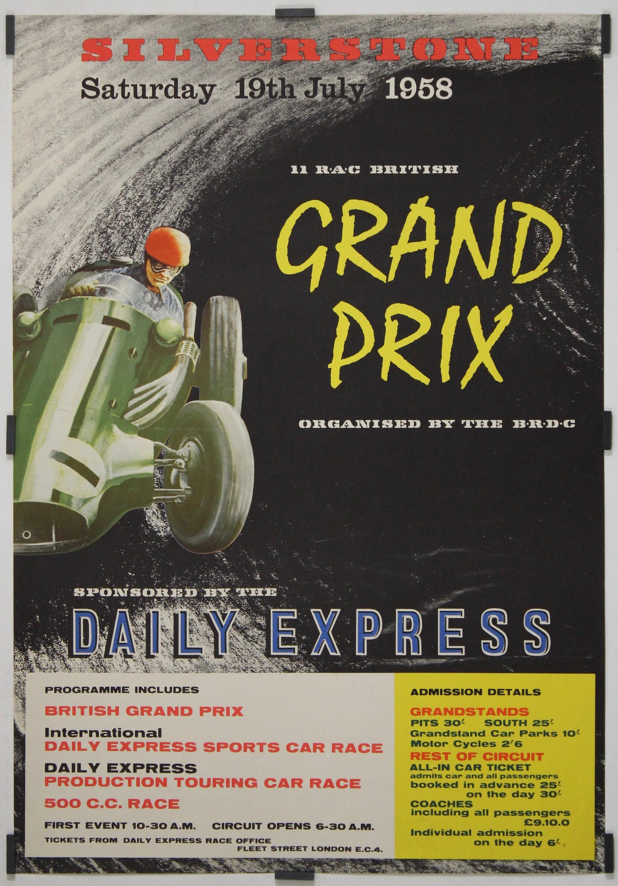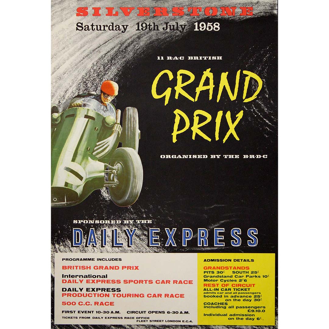 This striking 1958 original poster for the British Grand Prix at Silverstone captures the speed, danger, and glamour of post-war motor racing at the dawn of Formula One’s golden age. Announcing the race of Saturday, 19 July 1958, organized by the British Racing Drivers’ Club (BRDC) and sponsored by the Daily Express, the poster is both a sporting document and a powerful example of mid-century graphic advertising.