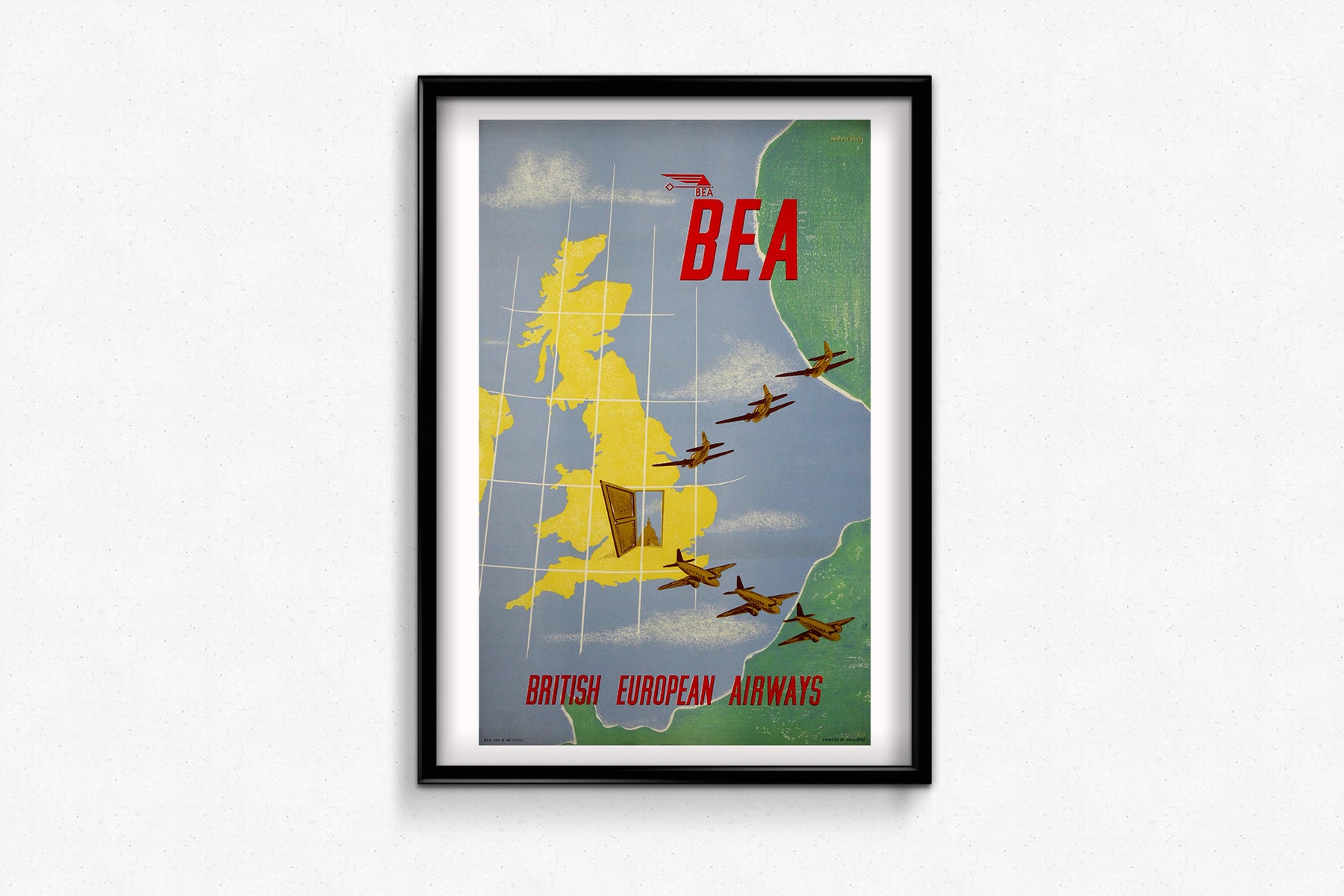 Beyond its role as advertising, this poster stands today as a historical document of early post-war aviation culture. It reflects a moment when airlines were not only transporting passengers, but shaping dreams of freedom, discovery, and a newly interconnected Europe. With its balanced composition and confident modern style, this BEA poster remains a fine example of mid-20th-century travel poster art and the visual language of progress.