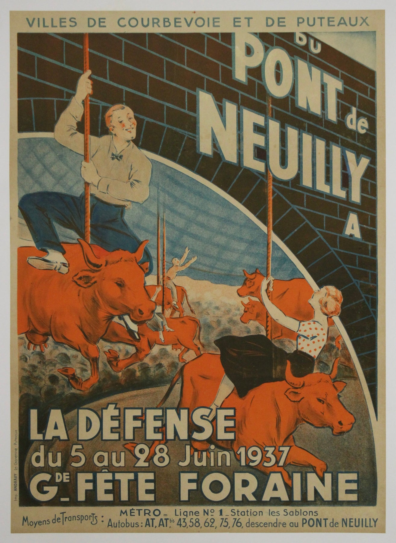 Au premier plan, des personnages animés – hommes, femmes et enfants – chevauchent joyeusement des taureaux de carrousel aux couleurs vives, agrippés à des barres verticales, le visage illuminé par l’excitation du mouvement et l’amusement. Ces animaux, aux proportions charmantes et exagérées, figés en plein galop, évoquent l’énergie vibrante des fêtes foraines, tout en reflétant le souvenir pastoral d’une région qui allait bientôt devenir le quartier d’affaires moderne de La Défense.