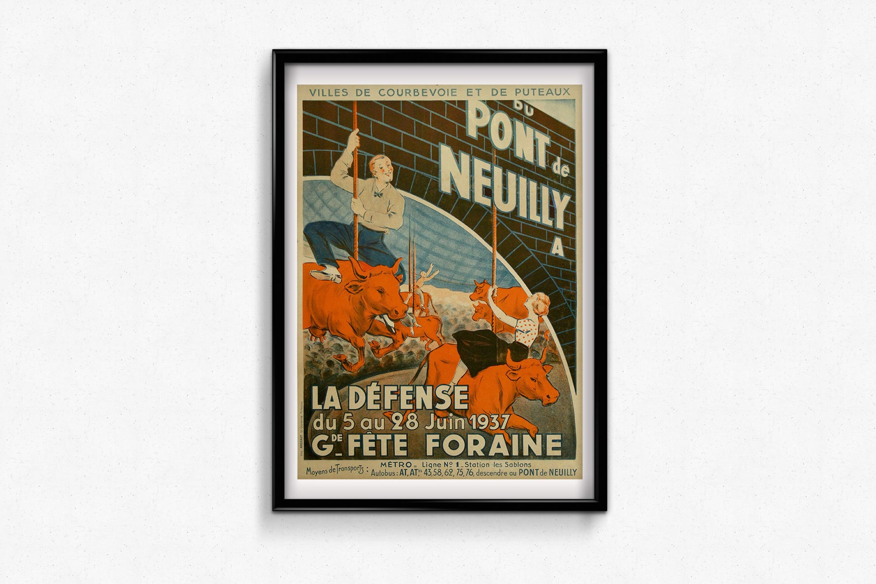 Cette affiche est un fascinant témoignage urbain, capturant un moment charnière de l'histoire parisienne. Avant que La Défense ne se pare de tours de verre et d'esplanades de béton, c'était un lieu de fêtes foraines, de cirques et d'animations de week-end. La fête foraine elle-même s'est tenue du 5 au 28 juin 1937, en même temps que l'Exposition internationale des Arts et Techniques dans la Vie Moderne, de l'autre côté de la Seine, reliant ainsi cet événement local éphémère à un vaste mouvement national d'innovation et de festivités.