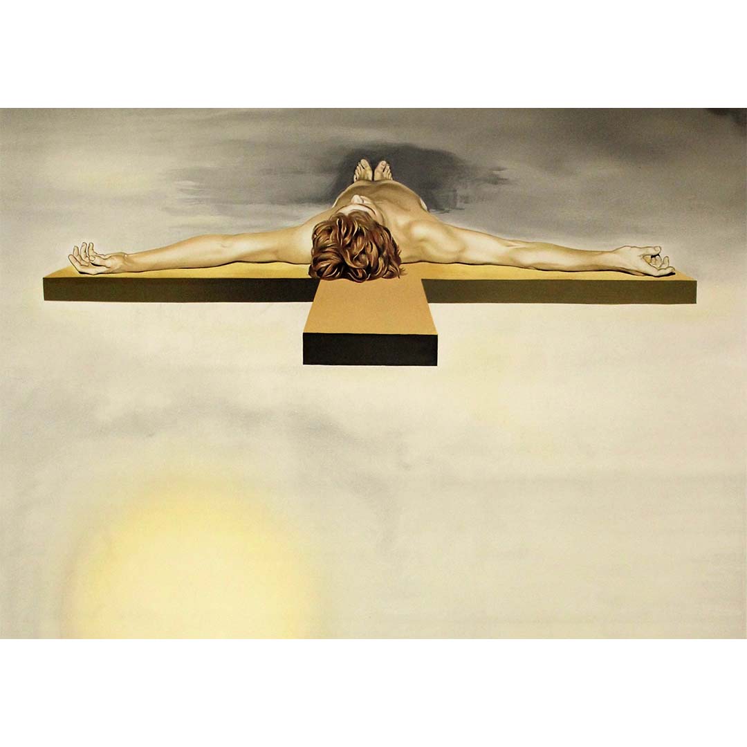 La figure crucifiée de Dalí est sereine, forte et étrangement légère, sans ombre ni effusion de sang. Le Christ flotte sur un ciel surréaliste et onirique, avec un soleil immense et radieux et un rivage mystérieux au loin. Dalí omet délibérément la couronne d'épines et les signes de souffrance, transformant la crucifixion en un événement cosmique, un pont entre divinité et science, mysticisme et mathématiques.