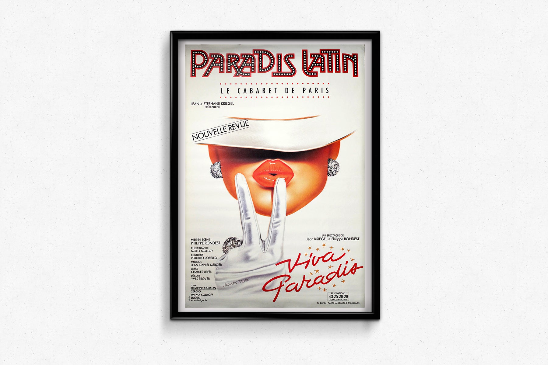 Cette affiche originale de 1990, signée Jacques Fabre, célèbre le glamour et le spectacle du Paradis Latin , l'un des cabarets les plus mythiques de Paris, et sa revue à succès Viva Paradis . Conçue pour promouvoir cette nouvelle revue dans le célèbre cabaret de la rue du Cardinal Lemoine, l'affiche rayonne d'une opulence théâtrale, de séduction et du charme intemporel des nuits parisiennes.