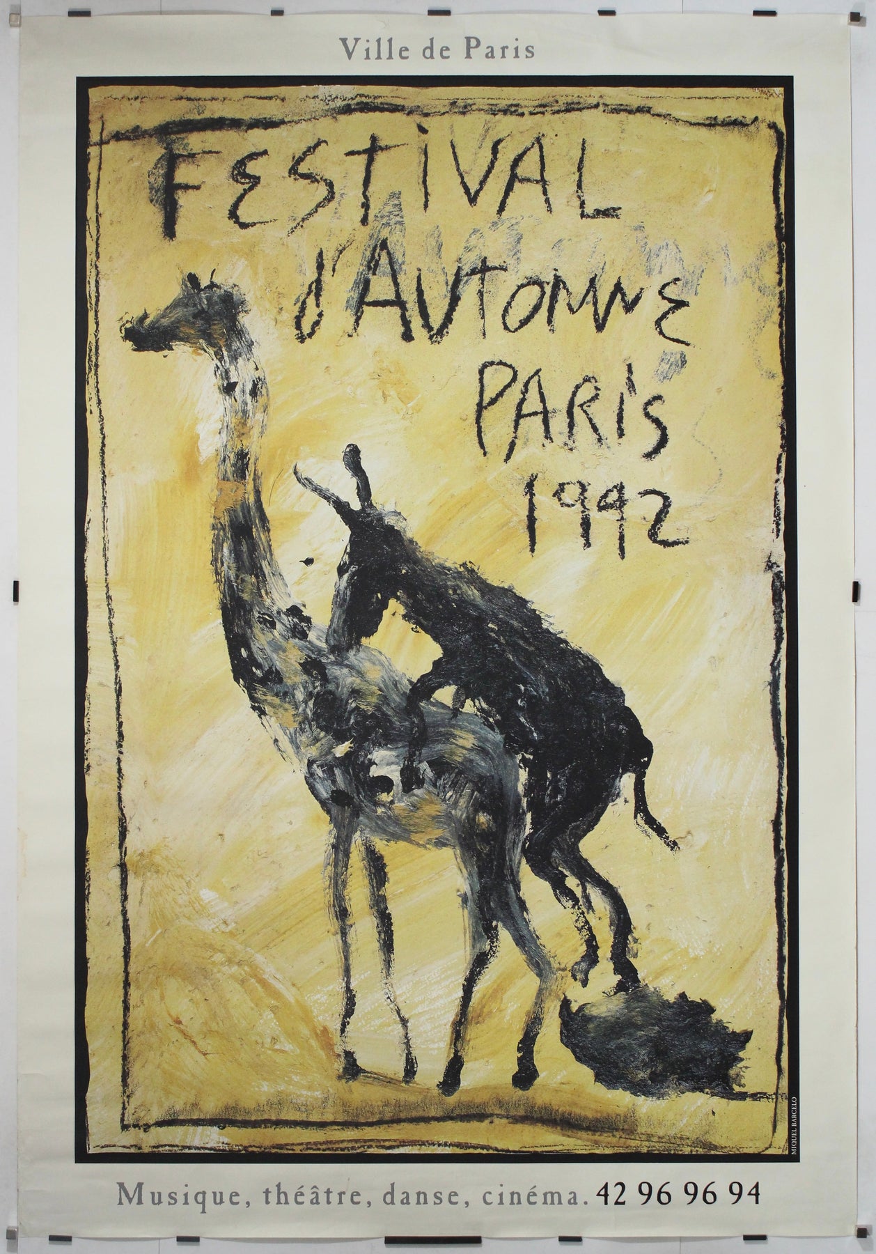 Cette affiche originale de 1992, créée par l'artiste contemporain espagnol Miquel Barceló, a été réalisée pour le Festival d'Automne à Paris , un événement pluridisciplinaire célébrant la musique, le théâtre, la danse et le cinéma. Réputé pour inviter certains des créateurs les plus expérimentaux et avant-gardistes du monde entier, le festival, à travers sa collaboration avec Barceló, reflète parfaitement son esprit audacieux et anticonformiste.