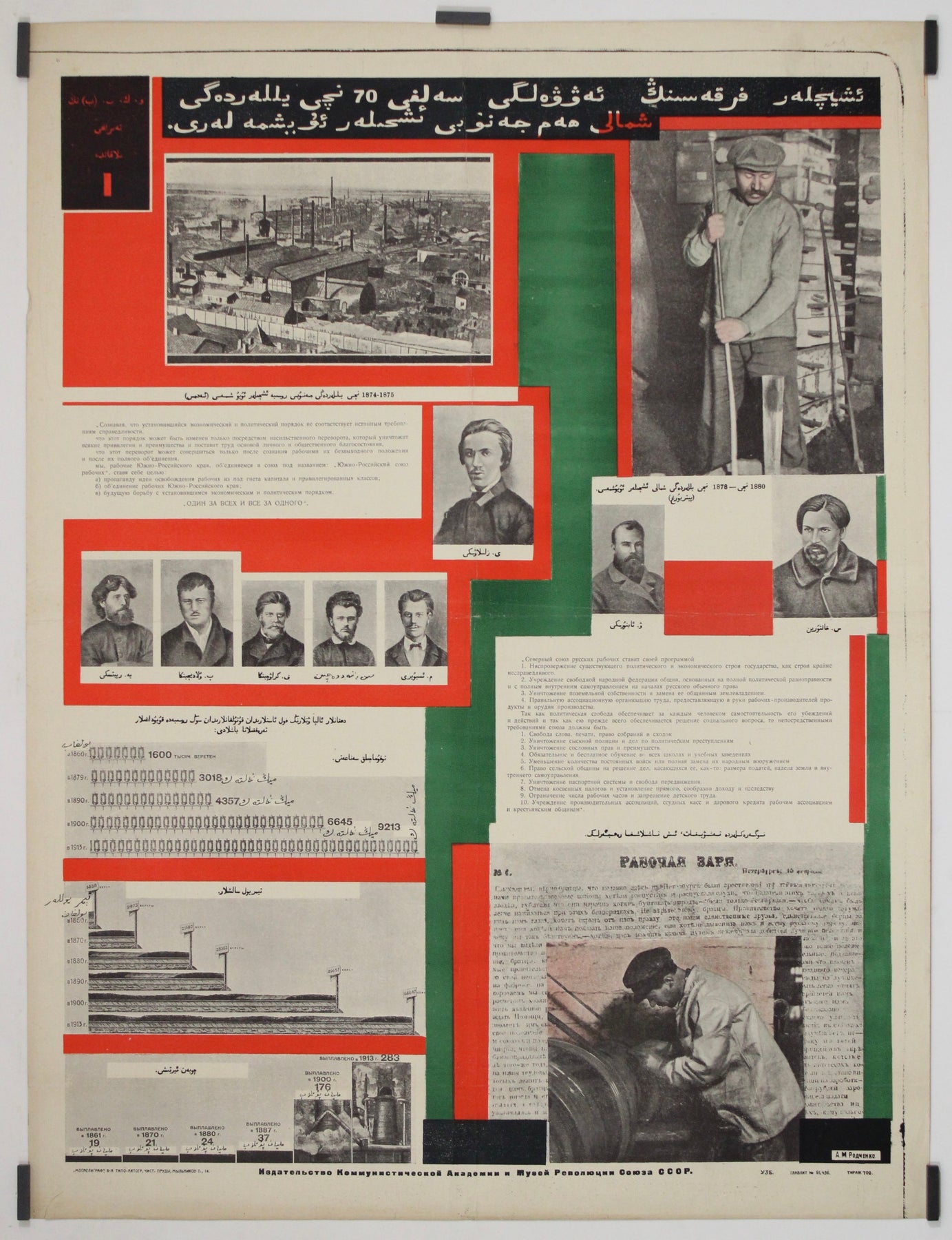 En 1926, Rodchenko réalisa une série de vingt-cinq affiches photomontées intitulée « Histoire du Parti communiste panrusse [VKP(b)] en affiches ». Commandées par le Musée de la Révolution, elles furent imprimées dans plusieurs langues soviétiques et diffusées à travers le pays. Chaque affiche illustre un moment historique marquant de l'histoire du Parti. Composées de photos de presse, de graphiques, de coupures de presse et d'autres documents, elles furent agencées géométriquement sur un fond rouge et noir. Numérotées dans le coin supérieur gauche, les affiches de celle-ci, la première, abordent les origines du Parti communiste et présentent « les syndicats ouvriers du Nord et du Sud des années 1870, ancêtres du parti ouvrier ». Imprimée en azéri, cette affiche fut tirée à seulement 300 exemplaires.